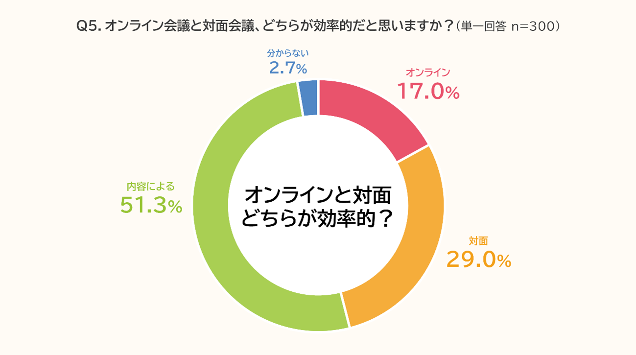 オンライン会議と対面会議の効率については、「内容による」(51.3%)が最も多く、過半数を占めました。次いで「対面」(29.0%)、「オンライン」(17.0%)という結果となりました。このことから、会議形式の優劣というよりも、議題や目的に応じた適切な形式の選択が重要であると認識されていることが分かります。