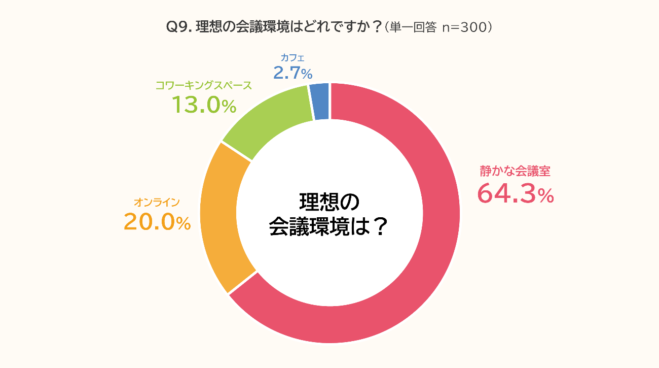 理想の会議環境については、「静かな会議室」(64.3%)が最多となり、他の選択肢を大きく上回る結果となりました。次いで「オンライン」(20.0%)、「コワーキングスペース」(13.0%)などが続きました。この結果から、効率的な会議の実施には、集中できる環境が重要であり、対面であっても質の高い空間が求められていることが分かります。