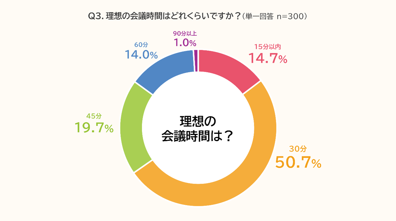 理想の会議時間については、「30分」(50.7%)が最多となり、半数以上を占めました。次いで「45分」(19.7%)、「15分以内」(14.7%)と続き、全体として短時間志向が強い結果となりました。この結果から、多くのビジネスパーソンが現在の会議時間に対して長さを感じており、より短時間で効率的に進める会議を求めていることがうかがえます。