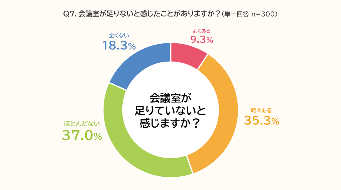会議室が足りないと感じたことについては、「時々ある」(35.3%)、「よくある」(9.3%)を合わせると約4割となりました。一方で「ほとんどない」(37.0%)、「全くない」(18.3%)という回答も見られました。この結果から、企業によって差はあるものの、一定数のビジネスパーソンが会議室不足を実際に経験しており、会議環境の整備が課題となっていることが分かります。