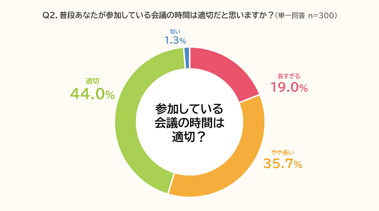 普段参加している会議の時間について、「長すぎる」(19.0%)、「やや長い」(35.7%)と回答した人が合計で54.7%となり、半数以上が会議の長さに課題を感じていることが分かりました。一方で「適切」とする回答も44.0%あり、一定の納得感も見られました。