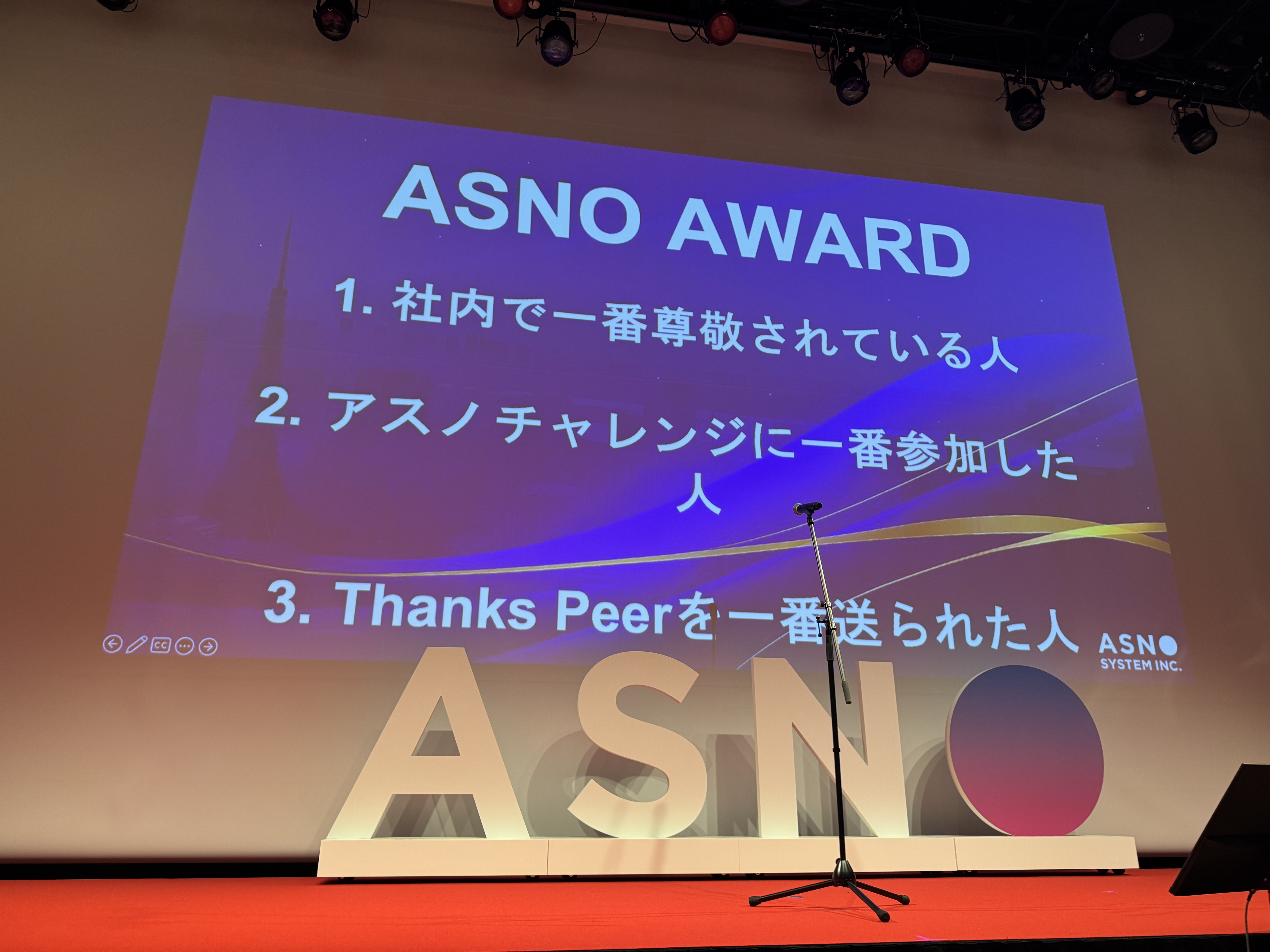 テーブル対抗のクイズ大会や日頃の感謝を伝えるメッセージカードの朗読、表彰式とは別に「アスノチャレンジに一番参加した人」「Thanks Peer(社員同士で称賛を贈り合う福利厚生サービス)を一番贈られた人」などへの表彰を行う『ASNO AWARD』 など、社内のコミュニケーションを深めるさまざまな企画が行われました。